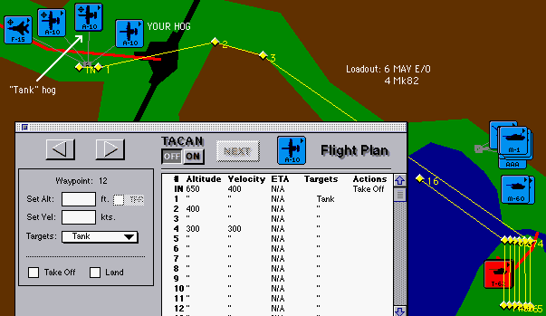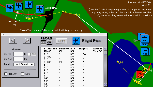 NOTE: If all WAY INFO is set up properly, the F-15 and the two A-10s will start engines and taxi straight out in perfect unison when you UNPAUSE the game. Hop in your Hog and make sure this happens before you taxi out yourself. The computer planes, if programmed correctly, make all the difference in this mission. If one of them gets left behind because a TACAN command was omitted, your chances of success drop. (And if it's the F-15 that doesn't make the trip, your chances of completing the mission successfully disappear almost completely...unless you luck out and the game decides not to throw any enemy aircraft at you. It happens, albeit rarely.)
