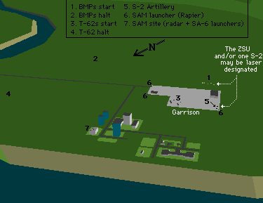 There are SAM launchers at the eastern and western corners of the garrison (See "Battlefield Diagram" graphic below) and usually this salvo of HARMs combined with the Anti-Aircraft computer hog takes all or most of them out. If not, you'll know it because you'll be dodging missiles all day.