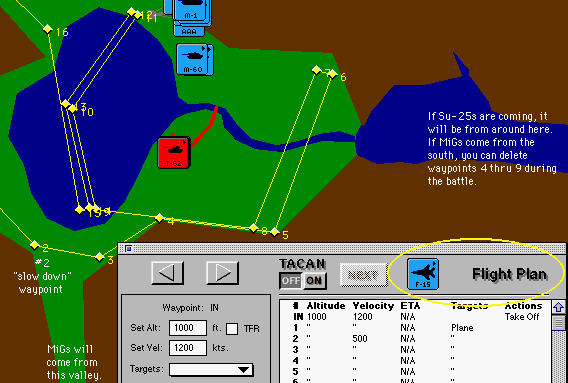 Program the F-15 to fly straight to the southern tip of the lake (the gap in the mountains) as fast as possible. I set his speed enroute at 1200 kts, but set a special waypoint to slow him down when he gets there, or else his tremendous momentum may send him into a mountainside. Set altitude 1000' and target "Aircraft" of course. (See "F-15 - Way Info" graphic below)