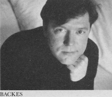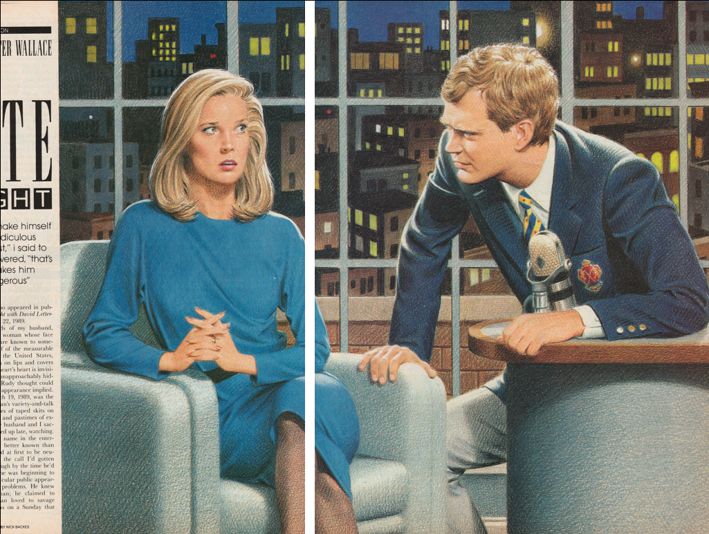 5/3/2001. Just found this. It's from Playboy, June 1988, bottom of page 3. "Late Night" was, by a very long shot the first Wallace story I read (I didn't read IJ until 1998) and I must have read the author's name at the time since I liked the story quite a bit, but the name didn't stick. I didn't make any connection until, upon completion of Infinite Jest and A Supposedly Fun Thing and Broom Of The System, I was perusing Girl With Curious Hair in Barnes & Noble. I offhandedly had begun reading the story titled "My Appearance"...recognition of the first sentence was instantaneous, as was a clear memory of Nick Backes's unforgettable illustration of Letterman leaning forward—almost over his desk—toward a poised but chary blond actress. I think I said, more loudly than was probably appropriate for the location: "I'LL BE DAMNED!" 4/2/2017. Added a much better scan of the DFW-as-pup image, as well as images of both Mr. Backes and his aforementioned work. |