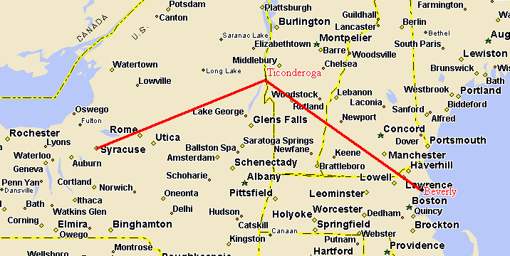 • On page 403 "historic and now hideously befouled Ticonderoga, NY" (not NNY, notice) is mentioned as being located at the "near-right-angle" of the concavity.