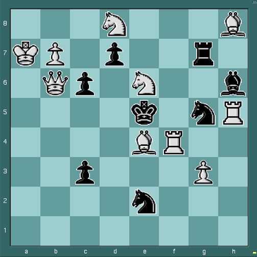 The best move for Black in this hopeless situation—being down a Queen, a Rook and a Bishop—is probably 1...d5, but of course 2. Qc7# immediately ends the game. The only other moves Black has are 1...d6 and 1...c5 both of which fall to 2. Rf5#. (Uncle Ruka there on e2 has five moves, but each and every one is thwarted by 2. Qd4#)